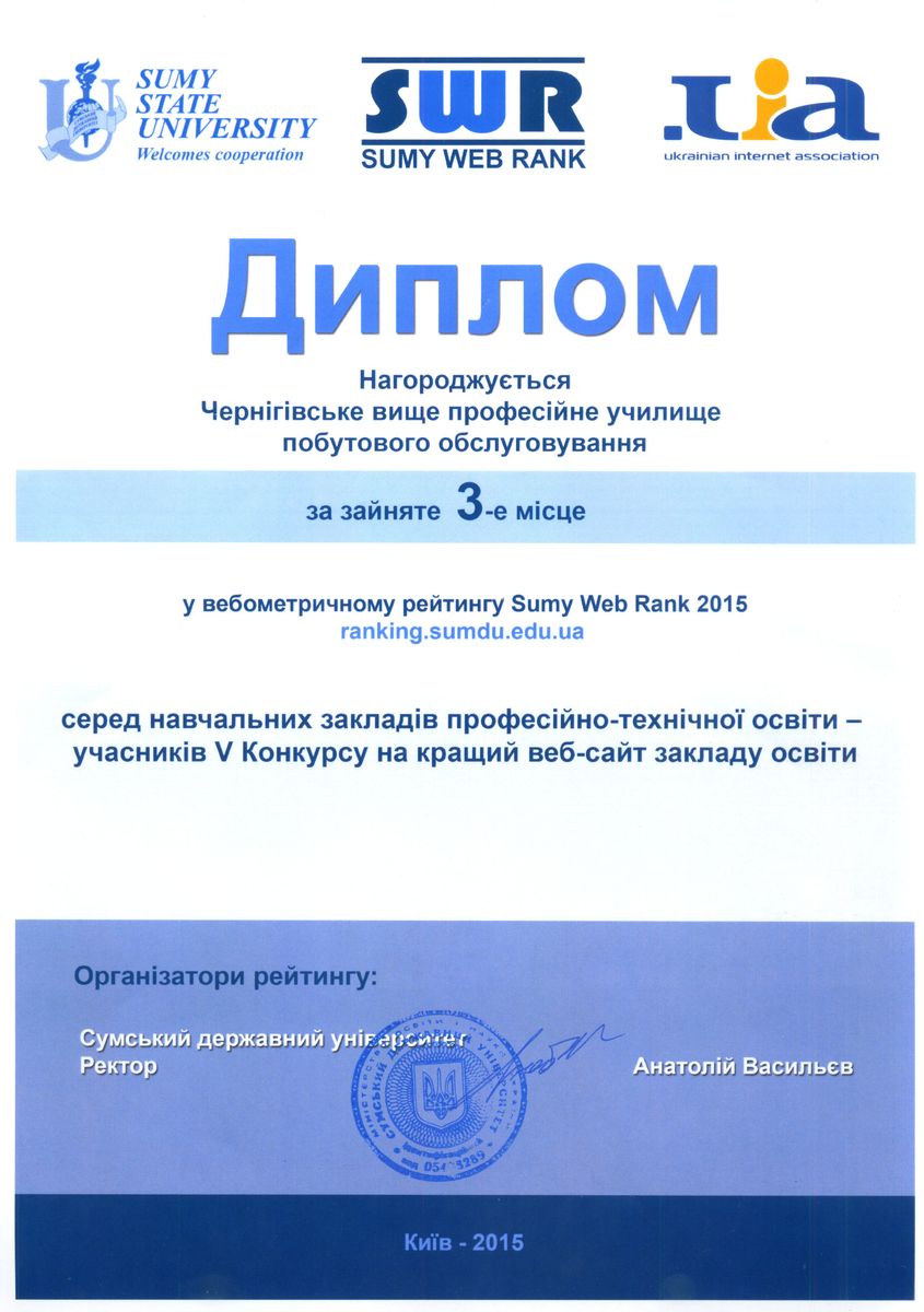 В сучасному світі панують інформаційні технології. Чернігівське вище професійне училище побутового обслуговування велику увагу приділяє розвитку власного інформаційного ресурсу, яким і є наш веб-сайт. Кожен сайт, як і людина, – індивідуальність. В березні-квітні 2015 року проходив V Конкурс на кращий веб-сайт навчального закладу, що проводиться Інтернет-Асоціацією України. Під час якого був визначений вебометричний рейтинг довузівських навчальних закладів SWR (Sumy Web Rank) Сумським державним університетом. На відміну від експертних оцінок, вебометричні оцінки не є суб'єктивними та отримуються незалежним чином з відкритих джерел, що робить даного виду рейтинги надзвичайно популярними у всьому світі.